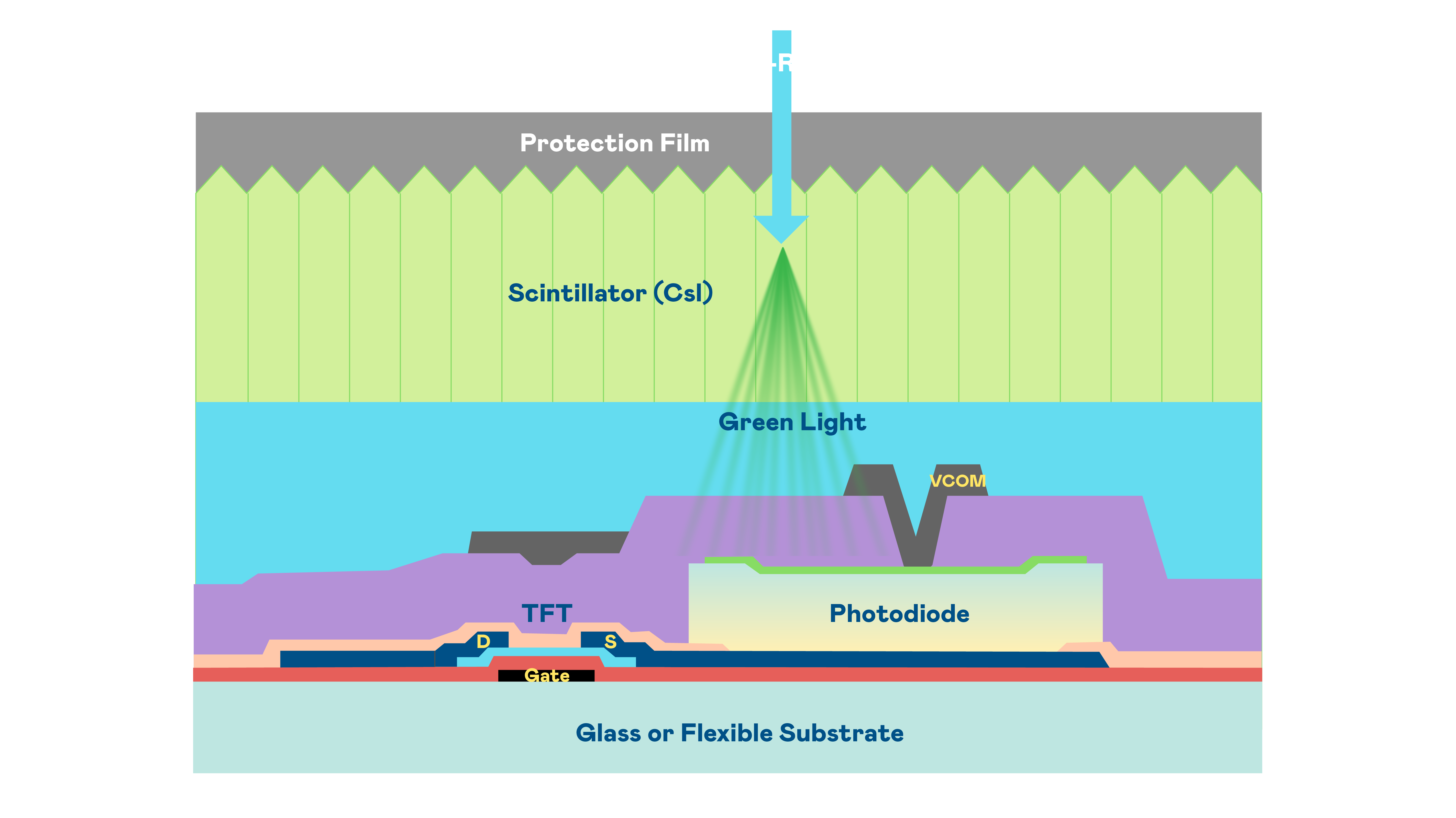 PA旗舰厅的X光影像感測陣列使用薄膜電晶體 (TFT) 作為每個像素的讀取開關,搭配光電二極體(Photodiode)的光電轉換元件,用以感測X光影像訊號。